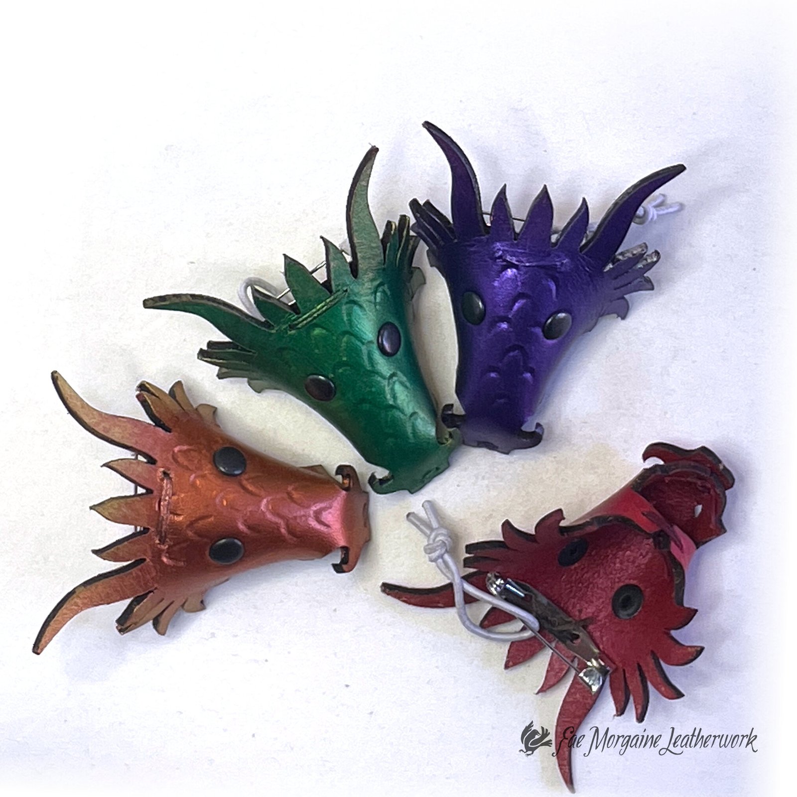 Shaped, textured and hand-painted vegetable-tanned leather dragon heads with a steel pin.